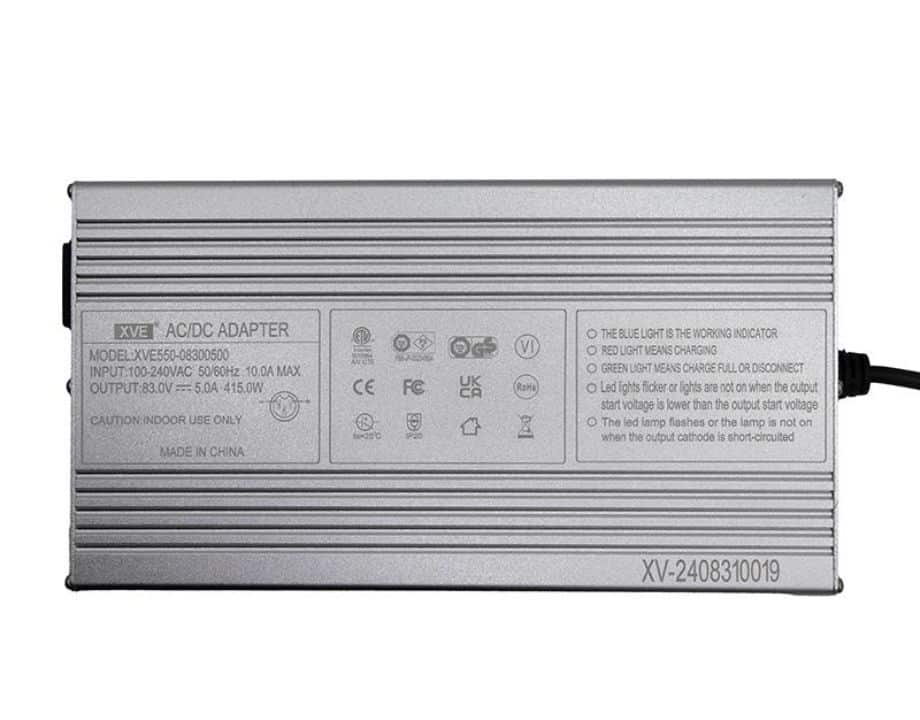 Con una salida precisa de 83 V y una potencia de carga de 5A, este cargador está diseñado para proporcionar una carga segura, estable y rápida.