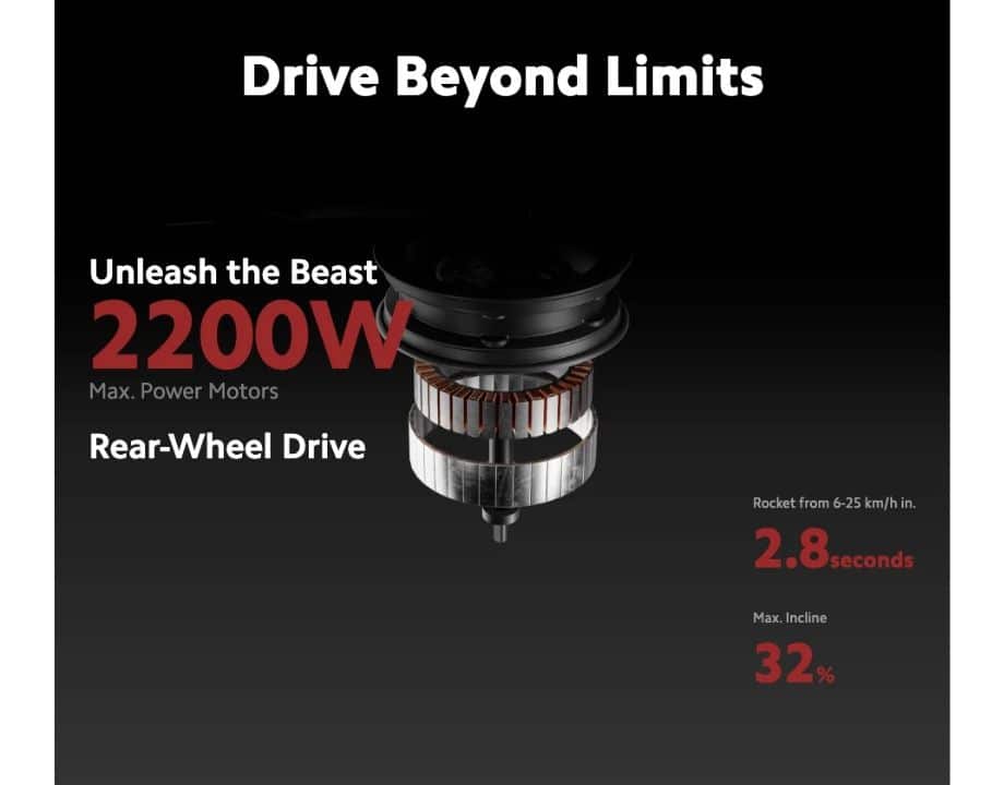 Cuenta con un motor de 700W nominales y 2200W de potencia máxima, capaz de alcanzar hasta 50 km/h y superar pendientes del 32%. Su batería de 899Wh (46.8V) ofrece una autonomía de hasta 110 km, con opción de carga rápida en 2–3 horas.